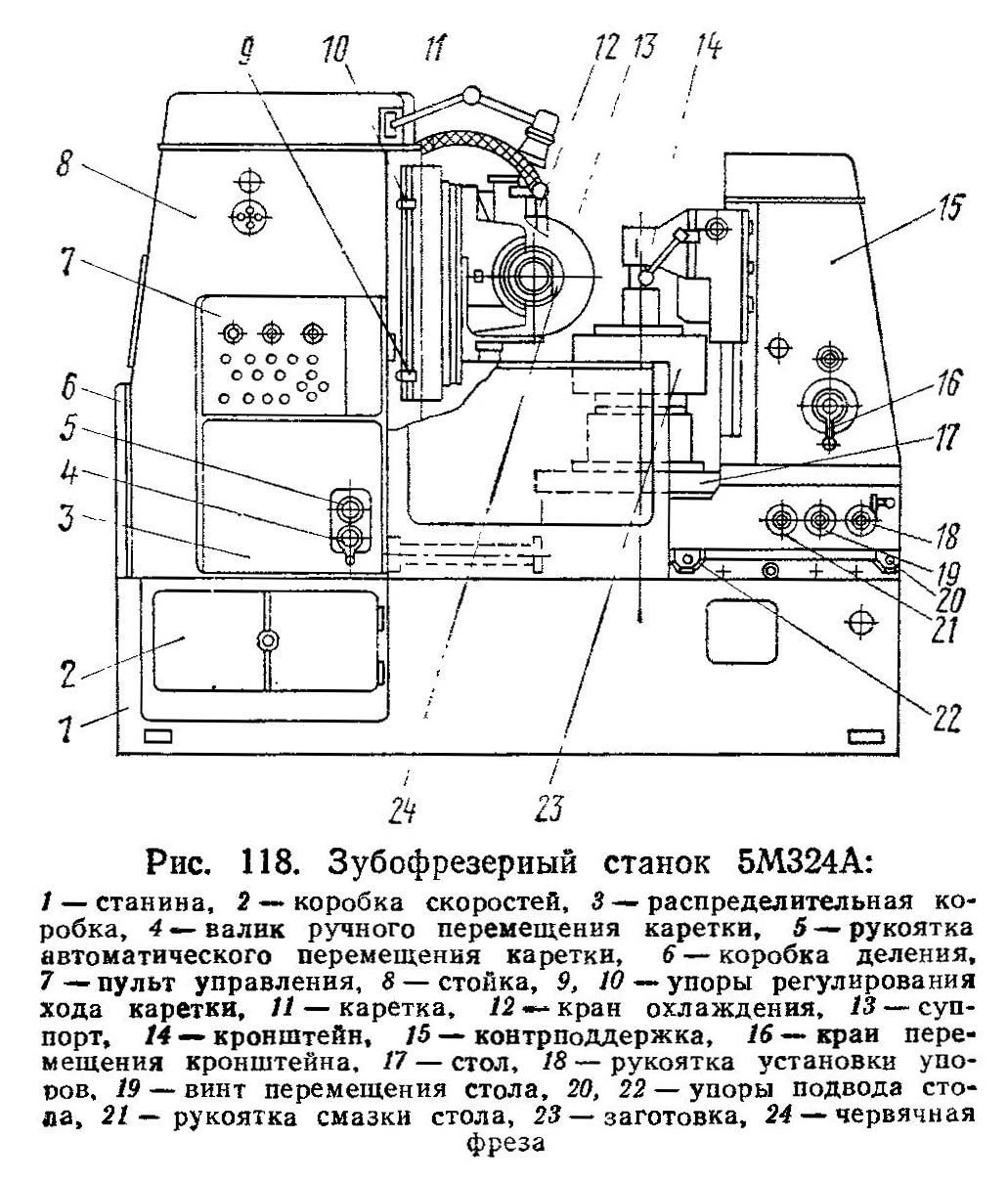 В станине 1 размещены коробка 2 со сменными зубчатыми колесами гітари головного руху. Главный електродвигатель, приводящий во вращение стол з нарезаемым зубчатым колесом 23 і инструментальный шпиндель з червячной фрезой 24, находится з задньої стороны станины. В станине размещен транспортер стружки, приводимый во вращение от отдельного електродвигуна. Резервуар для СОЖ находится в станине, откуда она насосом подается в зону обробки, а її количество регулируется краном 12.