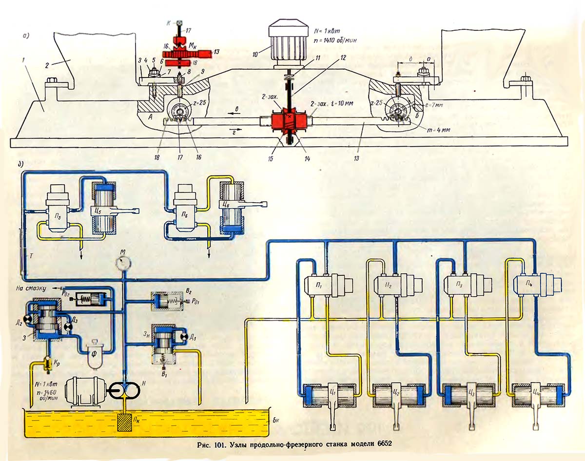 Как видно из гідравлической схеми керування (рис. 101,б), гідронасос Н (приводится во вращение от електродвигуна мощностью 1 кВт при 1460 об мин. Насос Н засасывает масло из бака Бк через приемник Пк і подает его под высоким давлением в систему керування рабочими органами верстата а под низким давлением — в систему змазки верстата.