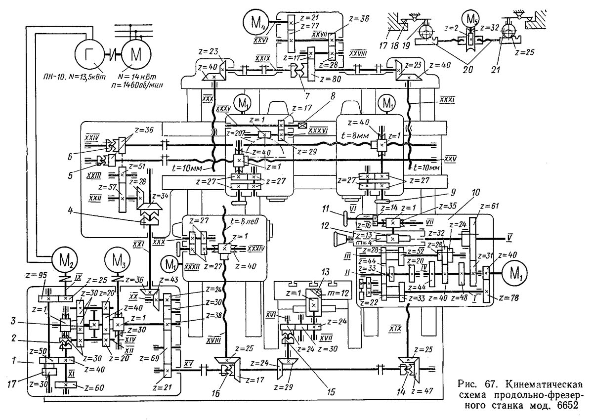 1. Кінематична схема фрезерного верстата 6652. Дивитись у збільшеному масштабі