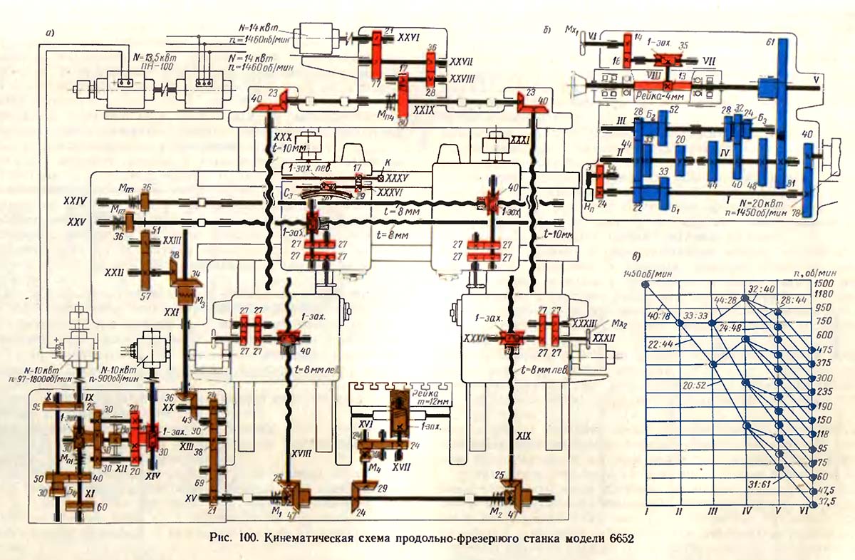 Вращение от електродвигуна мощностью 20 кВт через колеса 40—78 передається валу I коробки швидкостей. Двойной подвижной блок шестерен Б1 сообщает вращение валу II либо шестернями 22—44 (как показано на схеме), либо шестернями 33—33. Вал III получает вращение от вала II посредством двойного подвижного блока Б2 через шестерни 20—52 или 44—28. Далее вращение передається выходному валу IV коробки швидкостей тройным подвижным блоком шестерен Б3. Шпиндель V, как видно из графика швидкостей (рис. 100, в), получает 12 различных швидкостей обертання от 37,5 до 475 об/мин через цилиндрическую зубчатую передачу 31—61. Шпиндель смонтирован в подвижной гильзе і связан з приводной шестерней 61 шлицевым соединением.