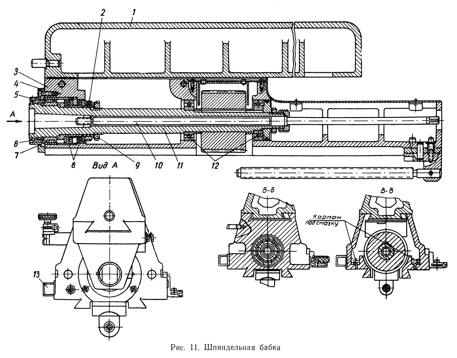 Горизонтальный шпиндель 11 (рис. 11) монтируют в шпиндельной бабке 3. Передней опорой горизонтального шпинделя служит двухрядный роликовый подшипник 7 з коническим отверстием. Осевые нагрузки воспринимаются упорными шарикопідшипниками 8. Средняя і задня опори — радиальные шарикопідшипники 12. Смазка опор — автоматическая.