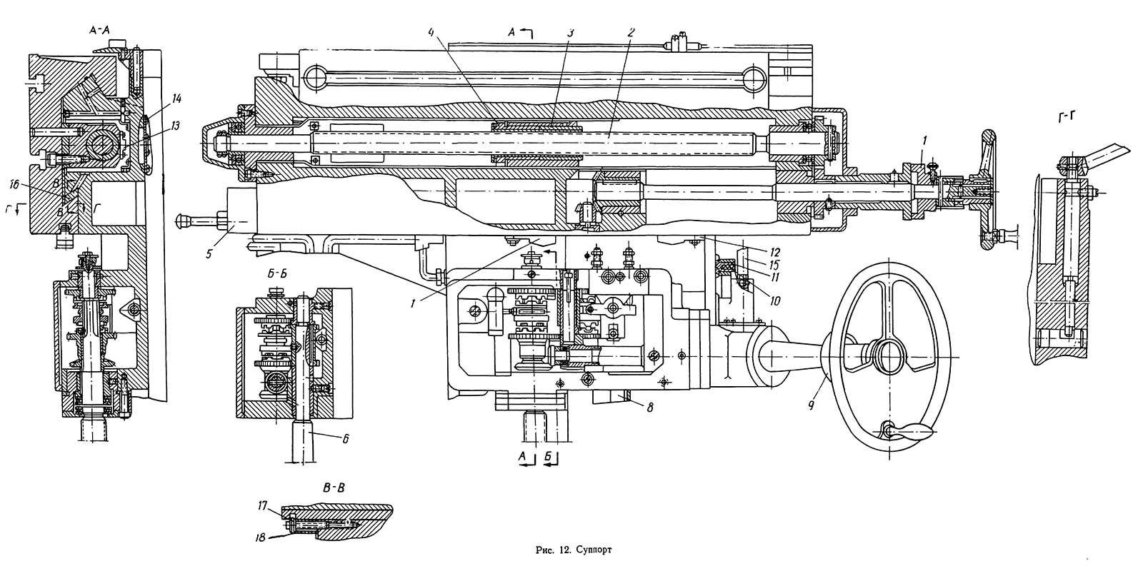 Установку суппорта контролируют по лимбам 1 і 9. Для особо точной установки суппорта применяют индикаторы і мерные плитки. Механізми суппорта смазывают з помощью ручного насоса 5.