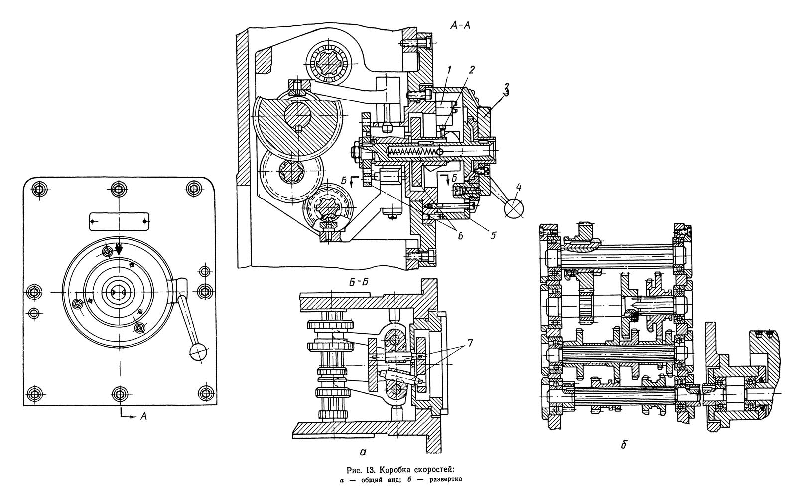 Коробка швидкостей (рис. 13) сообщает горизонтальному і вертикальному шпинделям 16 различных швидкостей.