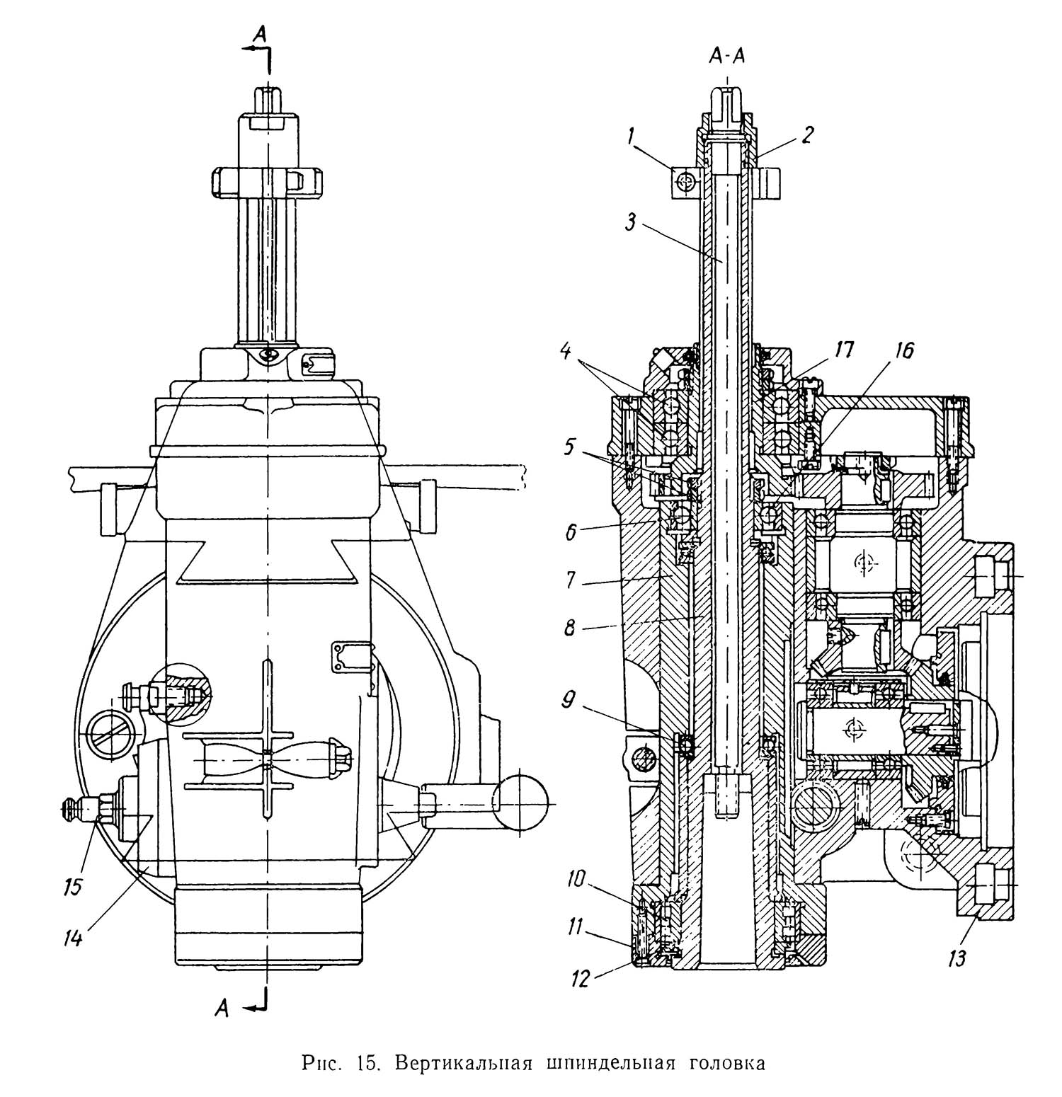 Для регулировки радиального і осьового зазору вертикального шпинделя шпиндель з гильзой выньте из корпуса 13 (рис. 15). При етом снимите з кінця шпинделя гайку 2 і упор 1, а также выньте валик-шестерню 15, предварительно сняв з него лимб 14.