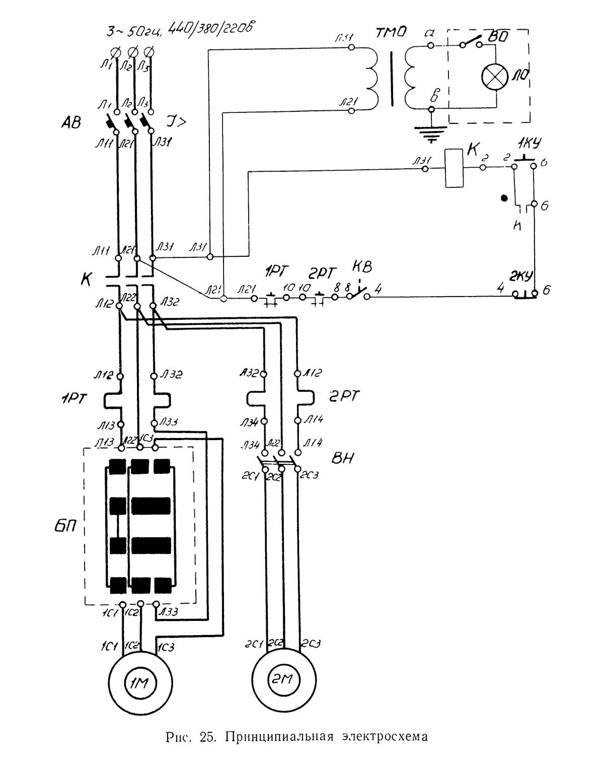 При переключении швидкостей ланцюг живлення катушки пускателя К разрывается конечным включателем KB, отключая при етом електродвигатели от сети. Для увімкнення електродвигателей після набора швидкостей нажмите кнопку 1КУ («Пуск»). Нажатием на кнопку 2КУ («Стоп») електродвигатели отключаются. При необходимости електронасос 2М може быть отключен от сети пакетным выключателем ВН. Реверсирование електродвигуна 1М осуществляют барабанным переключателем БП. Увімкнення і вимкнення местного освещения осуществляют выключателем ВО.