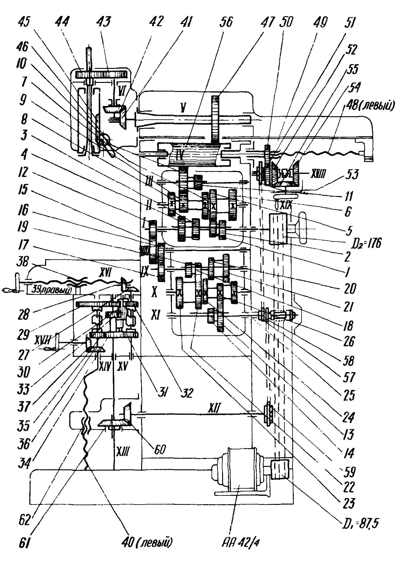 От вала XI через цепную передачу 58; 59 вращение передається валу XII, конической паре 60; 61, вертикальному валу XIII.