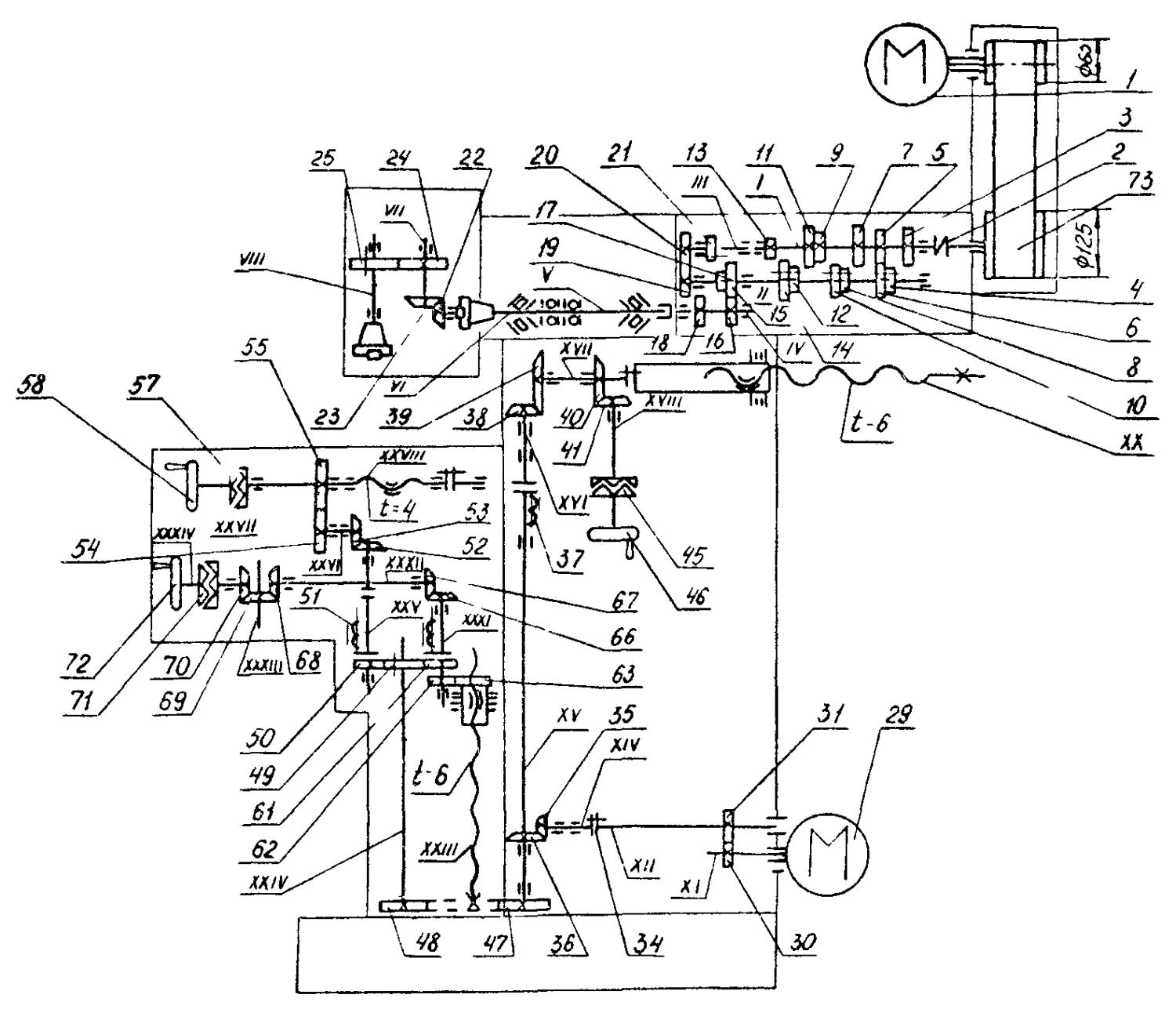 От електродвигуна подач 29 мощностью 1,3 кВт вращение через зубчатую пару 30, 31 і муфту 34 передається на вал XIV і через коническую пару 35-36 на вал ХV.
