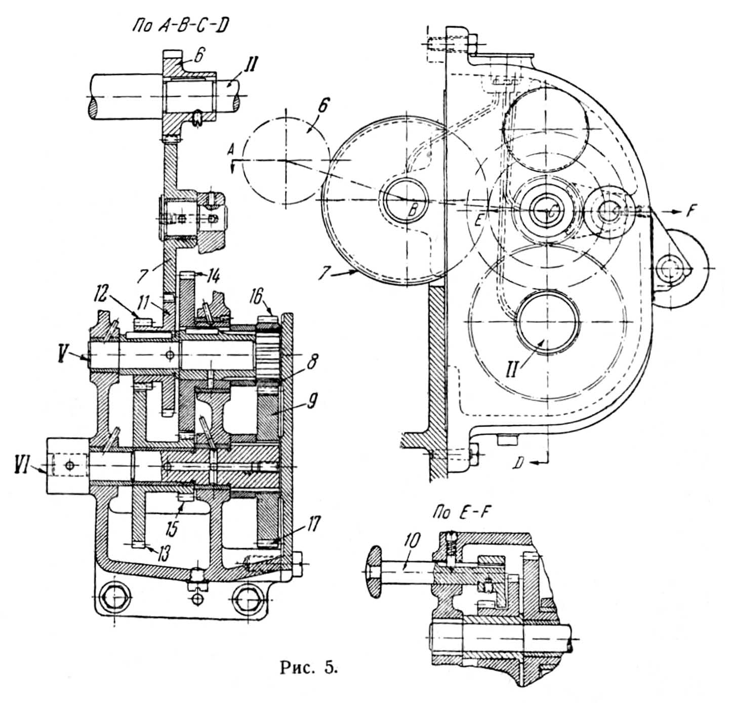Между етими шестернями расположена кулачковая муфта 3, скользящая по шпонке вдоль вала VI. Обе шестерни сцеплены з третьей конической шестерней 4, жестко закрепленной на вертикальном валу.