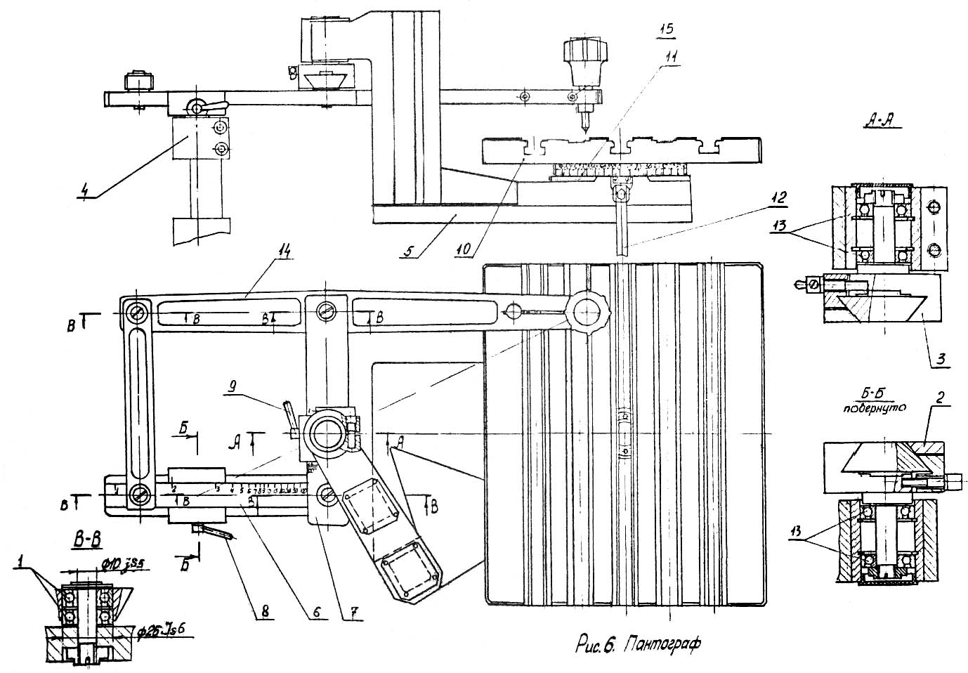 Плечи пантографа соединены между собой шарнирами, собранными на высокоточных радиально-упорных підшипниках I (Рис.6). При помощи кареток 4 і 5 пантограф соединен з корпусом шпинделя 4 і стойкой 5. Соединение выполнено также на высокоточных радиально-упорных шарикопідшипниках 13. Подвижные соединения пантографа з каретками выполнены в виде "ласточкиного хвоста". Изменение передаточного отношения пантографа (масштаба копирования) производится переміщенням плечей 6 і 7 пантографа относительно кареток 2 і 3 з післядующей фиксацией их рукоятками 8 і 9.