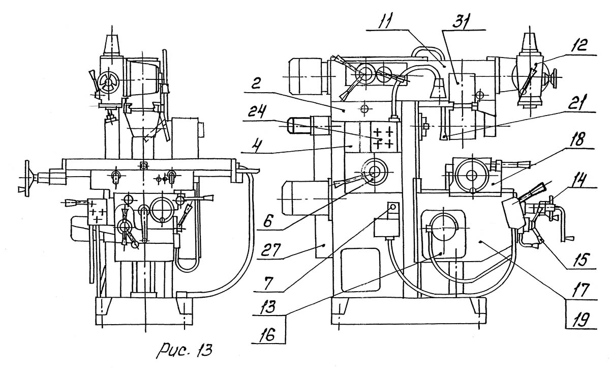 Рукоятка 7 на два положения включает один из двух рядов частоти обертання шпинделя: 31,5|... 180 Или 250...1400 об/мин.