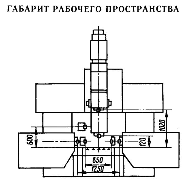 Габаритные розміри робочого простору продольного фрезерного верстата 6М610