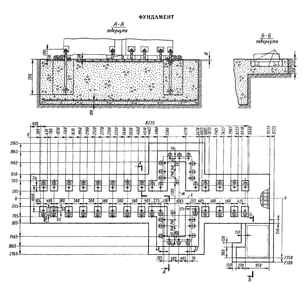 Креслення фундамента фрезерного верстата 6М610. Дивитись у збільшеному масштабі