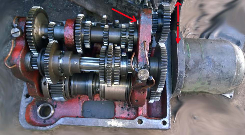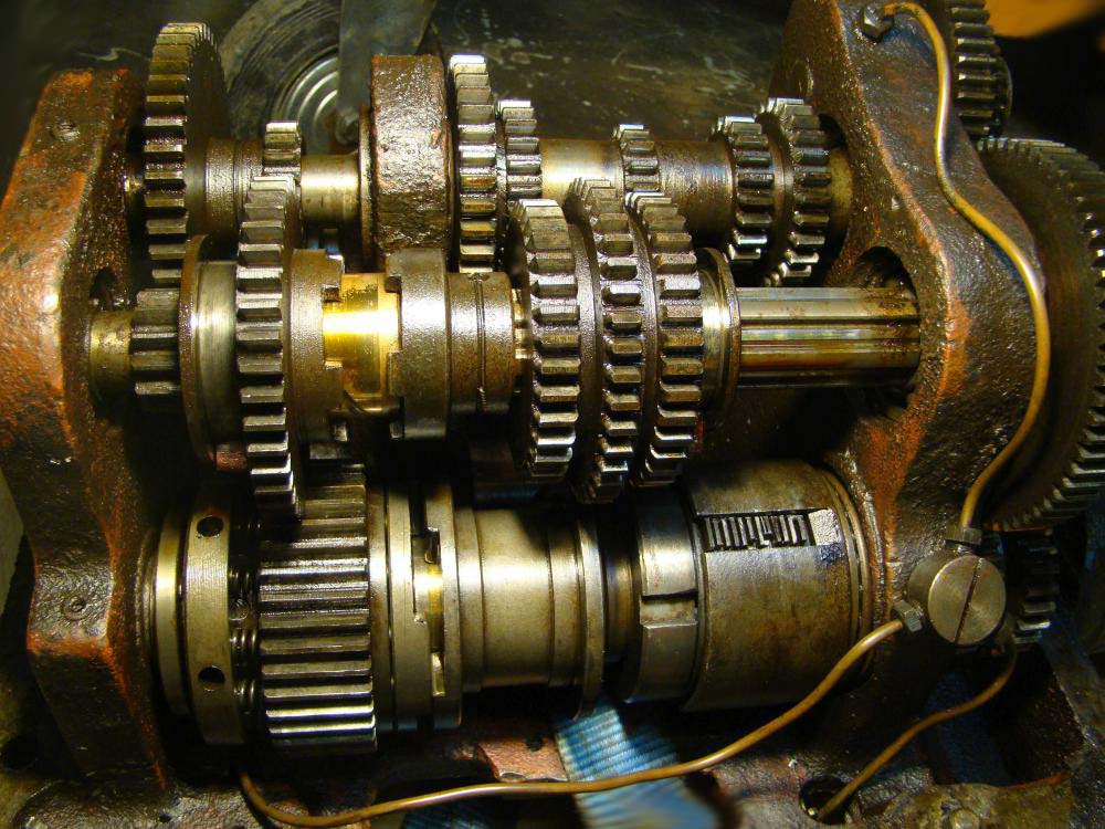 Муфта 6 може перемещаться на шпонке 4 вдоль втулки 5, которая нерухомо сидит на шпонке на фрикционном валу 14. При перемещении муфты 6 влево она сцепляется з кулачковой втулкой 3 зубчатого колеса 2 (z=40), находящегося в постоянном зацеплении з зубчатым колесом 1 (z=40) перебора коробки подач; таким образом, фрикционный вал получает от коробки подач 18 различных швидкостей в зависимости от положения переключаемых зубчатых колес коробки подач.