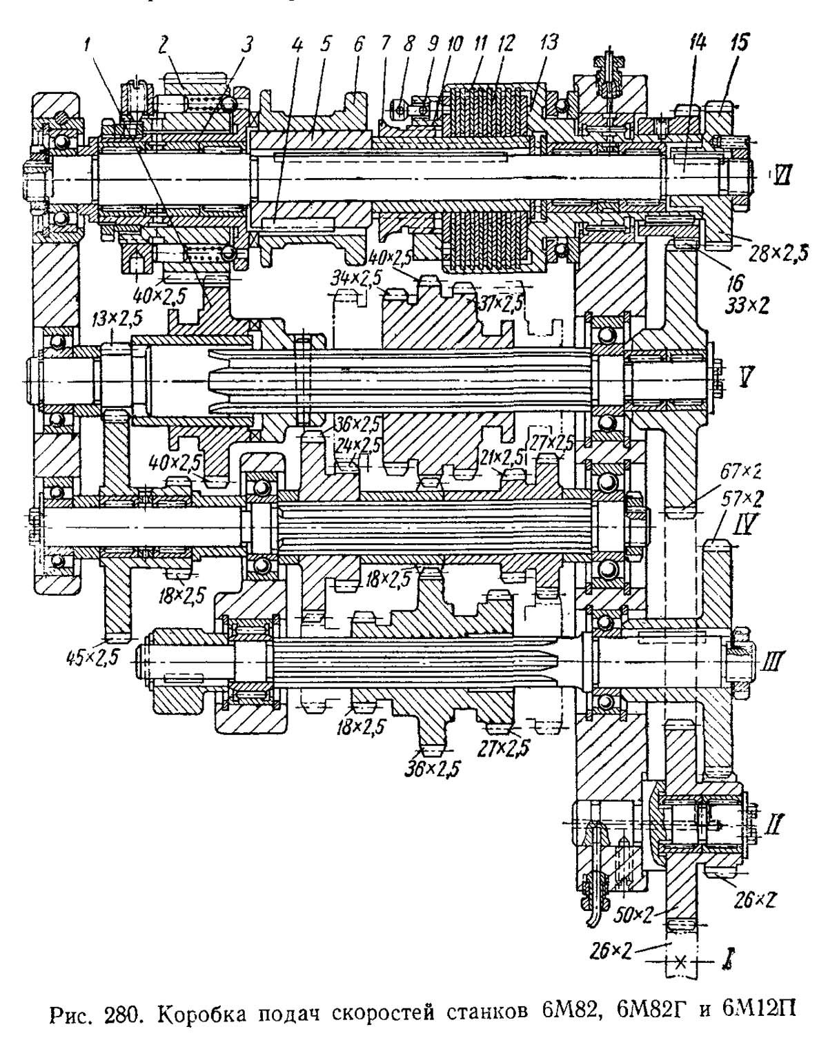 На рис. 280 дана развертка коробки подач, причем обозначения валов і зубчатых колес соответствуют схеме на рис. 272.
