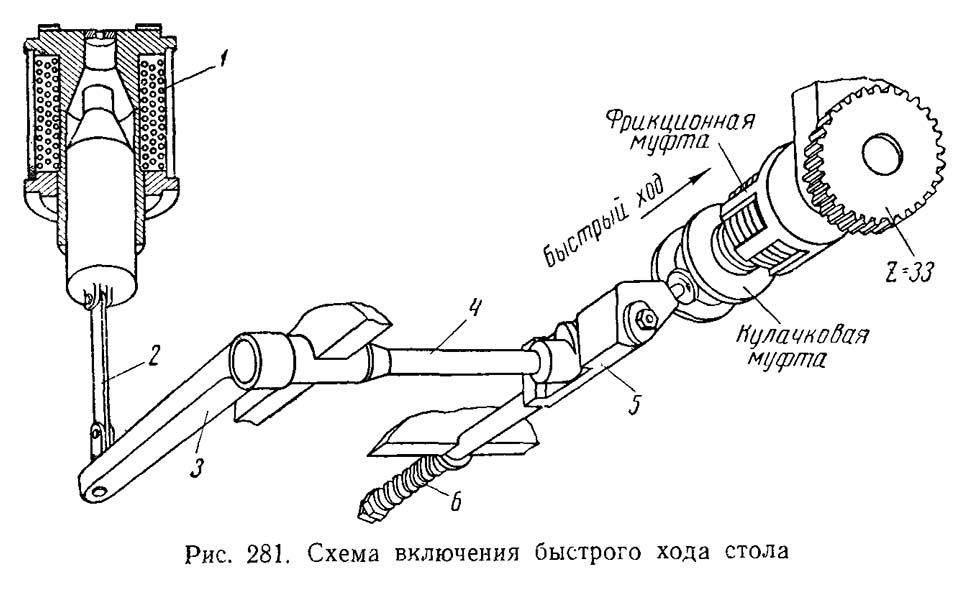 Фрикционная многодискова муфта включается нажимом кнопки «быстро стол» кнопочной станції (см. рис. 276). При нажатии кнопки срабатывает електромагнит 1 (рис. 281) і втягивает шток 2, который через рычаг 3, валик 4 і вилку 5 перемещает вправо кулачковую муфту. После того как кнопка отпущена, пружина 6 возвращает кулачковую муфту в исходное положение, т. е. в положение увімкнення, з зубчатым колесом предохранительной муфты.