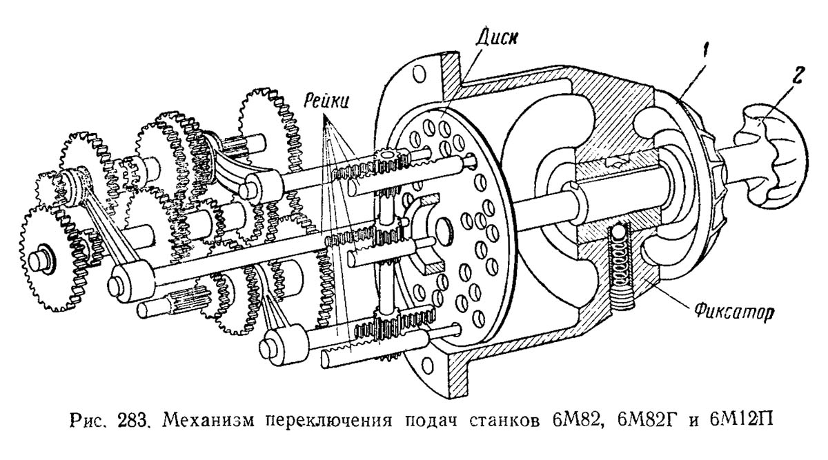 К корпусу коробки подач привернут механізм переключения подач (рис. 283), имеющий в передньої частини лимб для установки грибка на нужную подачу; подробно о назначении лимба і грибка было рассказано на стр. 41 (см. рис. 28, б). Переключення подач производится так же, как і переключение швидкостей. В данном случае необходимо грибок потянуть на себя і повернуть его вместе з лимбом до совпадения нужной подачі со стрелкой-указателем і затем вдвинуть его обратно. При етом диск, аналогичный диску 14 (см. рис. 278), перемещает три пары реек, на которые посажены вилки, охватывающие шейки блоков зубчатых колес і устанавливающие их в положение, соответствующее выбранной подаче.
