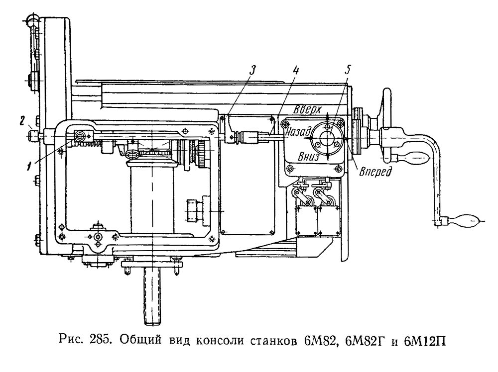Консоль (рис. 285) имеет чугунный корпус з развитыми направляющими профиля «ласточкин хвост» под станину і перпендикулярные к ним прямоугольные направляющие под салазки. Консоль несет на себе наступні органы керування: