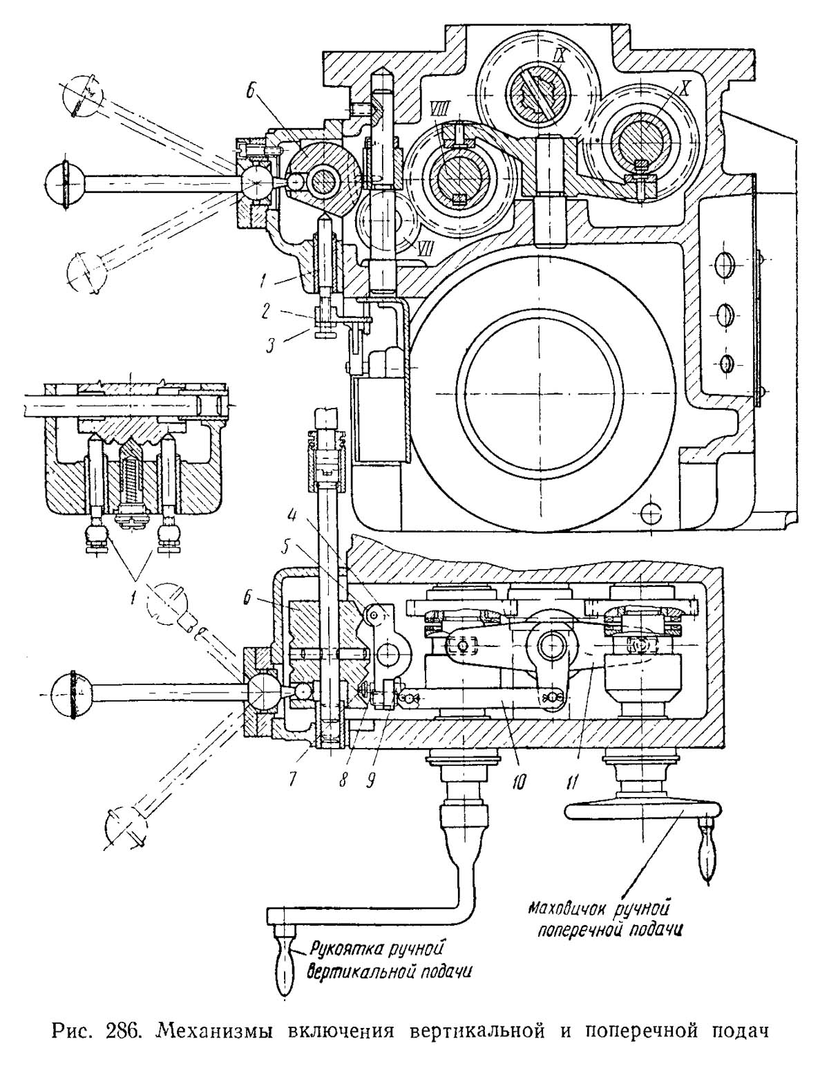 Конструкція рукояток керування поперечными і продольными подачами дана на рис. 286. Шаровой конец рукоятки входит в отверстие барабана 6, заштифтованного на тяге, идущей к коробке увімкнення подач на консоли. При движении рукоятки вправо или влево связанный з ней барабан соответственно движется поступательно, а при движении рукоятки вверх или вниз соответственно поворачивается.