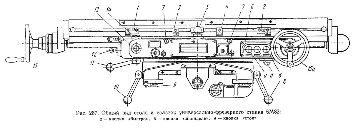 Наличие двух рукояток 5 і 1 позволяет фрезеровщику управлять вертикальными і поперечными ходуми не только спереди, но і сбоку верстата, что може понадобиться при фрезеровании торцовыми или кінцівыми фрезами задньої поверхности заготовки.