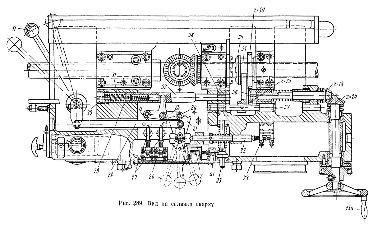 Для быстрых перемещений вращение от електродвигуна (на рис. 280 не показан) передається на вал VI через зубчатое колесо z=26, промежуточные зубчасті колеса z = 50 і z=67, минуя коробку подач, на зубчатое колесо 16 (z = 33). При такой передаче вал VI получает постоянное число оборотів, равное 1120 об/мин.