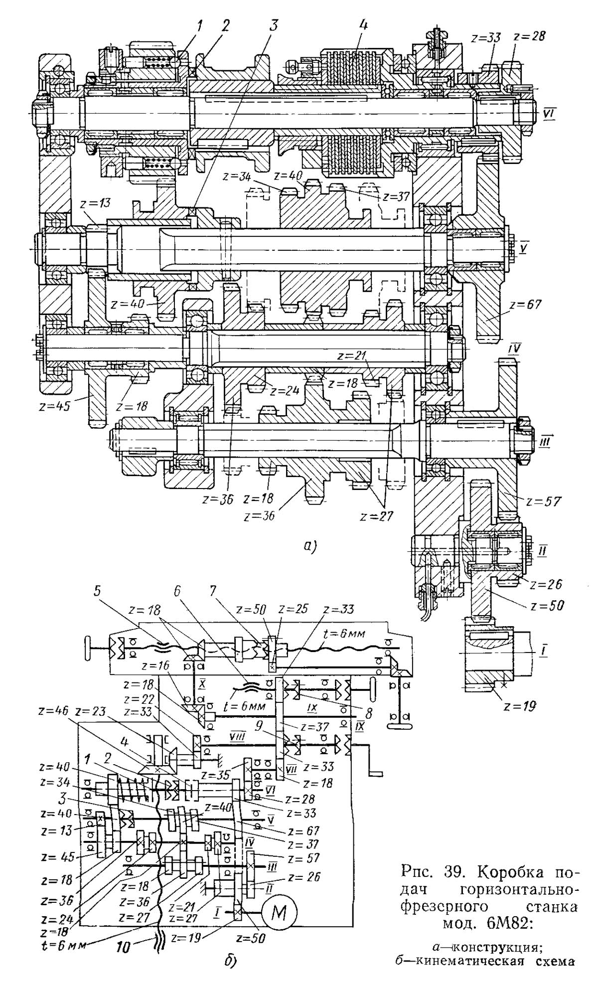 Вал I коробки подач (см. рис. 272) приводится во вращение непосредственно електродвигуном; от него вращение передається валу II зубчатой парой (26:50), валу III — зубчатой парой (26:57), валу IV—зубчатыми парами (18:36), или (27:27), или (36:18), валу V — зубчатыми парами (18:40), или (21:37), или (24:34) і далее валу VI через перебор (13:45) — (18:40) или непосредственной зубчатой передачей (40:40).