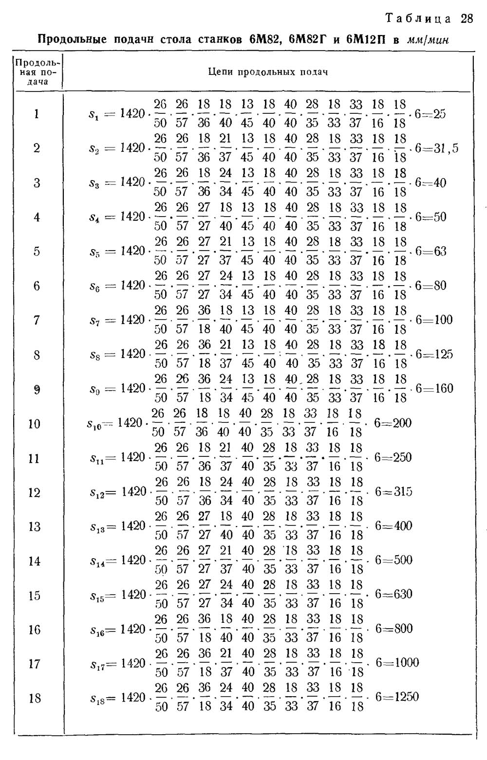 В табл. 28 приведены возможные увімкнення зубчатых колес для осуществления 18 различных продольных подач. Поперечные подачі имеют те же значения, вертикальные подачі — в три раза меньшие.