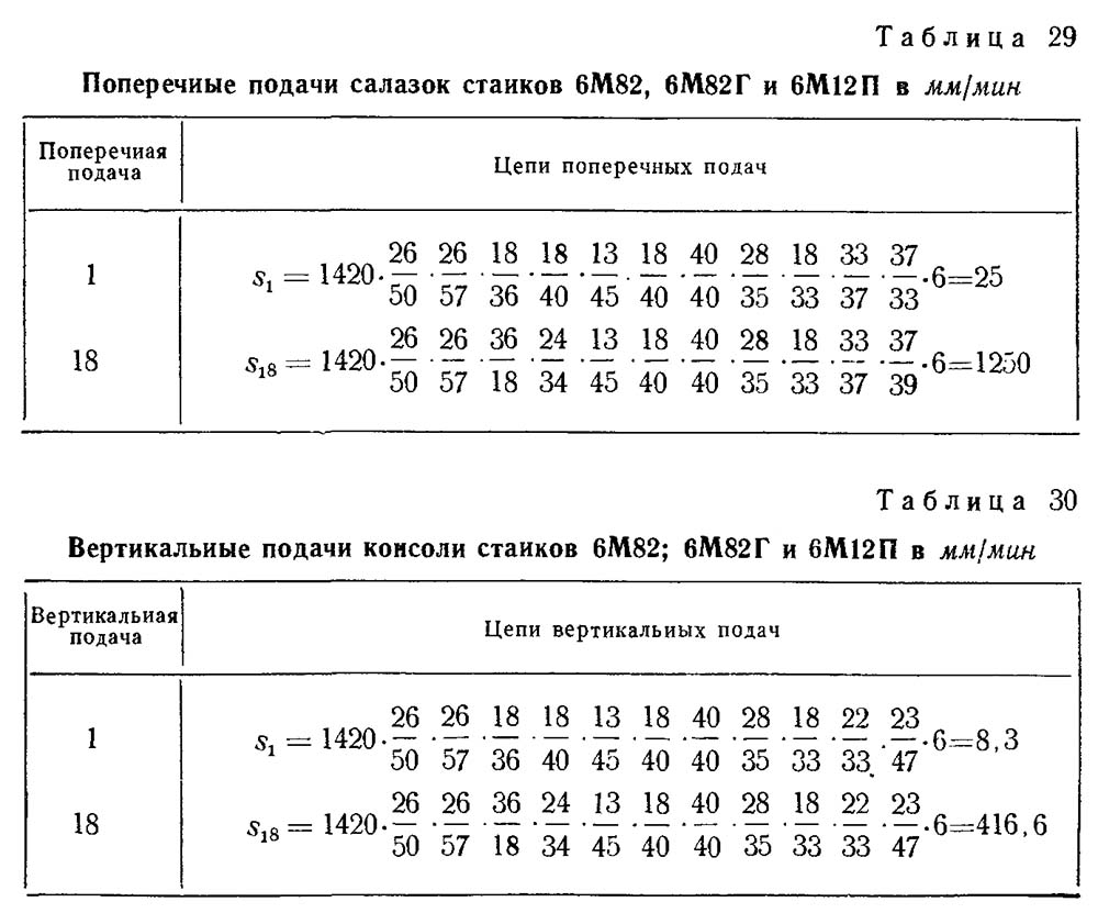 В табл. 29 приведены увімкнення зубчатых колес для двух крайних значений поперечных подач s1 і s18, а в табл. 30 — для двух крайних значений вертикальних подач s1 і s18.
