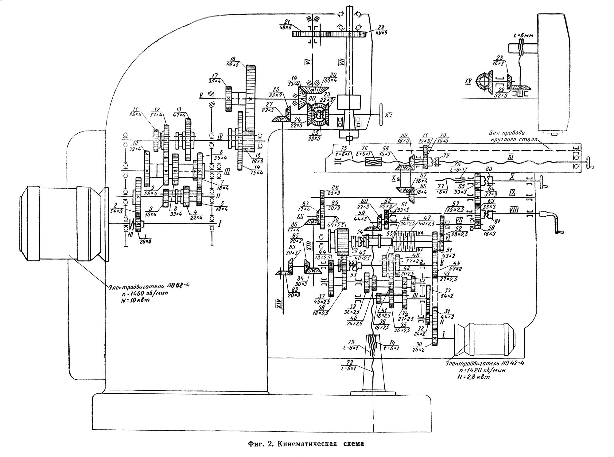 Шпиндель получает вращение от фланцевого електродвигуна мощностью 10 кВт через упругую соединительную муфту, 18- скоростную коробку швидкостей і через коническую і цилиндрическую пары шестерен (фиг. 2).