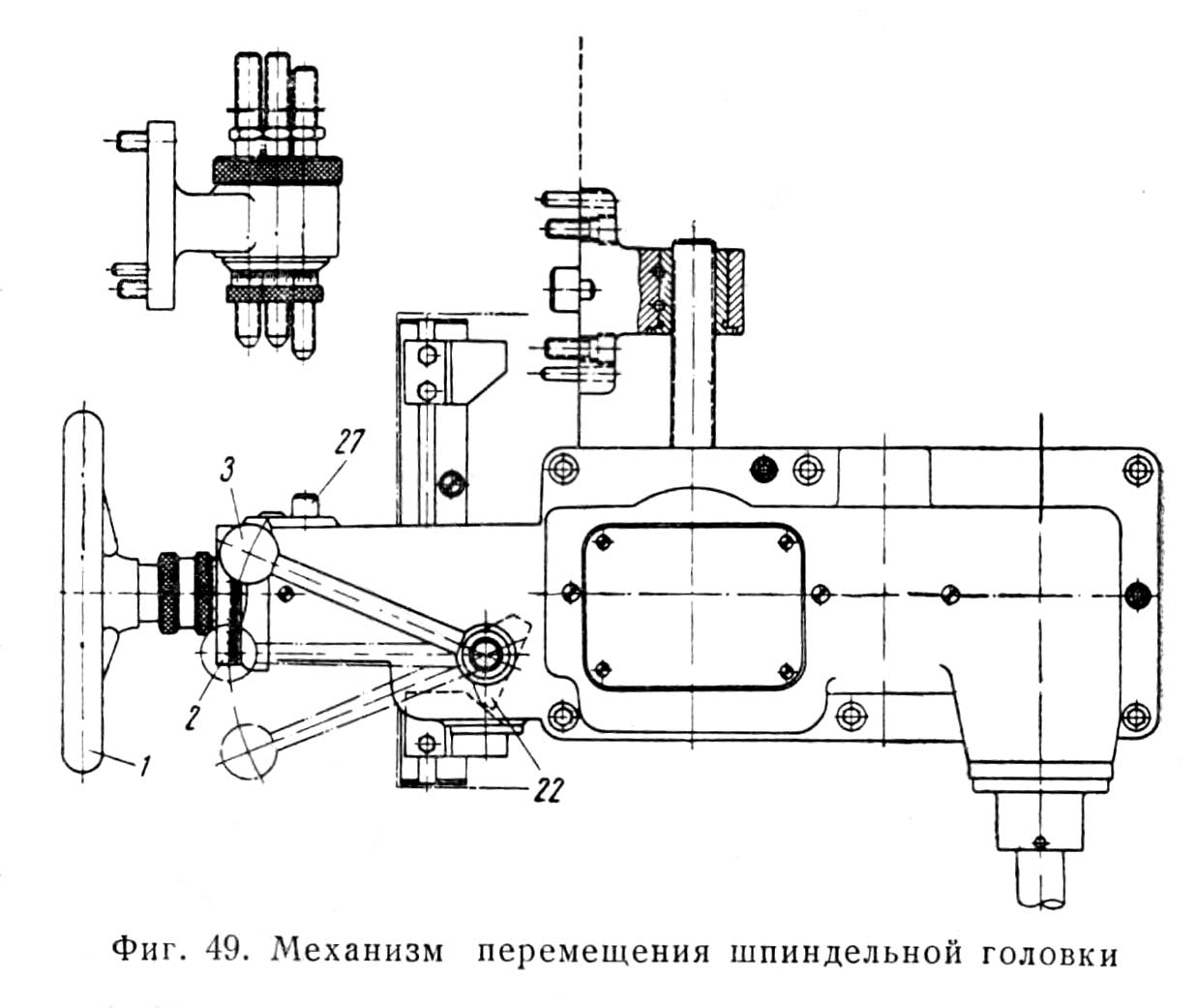 Масло от маслораспределителя подается ко всем пяти втулкам конических шестерен, смазывая одновременно і места зацепления шестерен. Отвод масла осуществляется через фланец 2 (см. фиг. 50), в который запрессована ступенчатая втулка, образующая маслосборник, откуда масло отводится через медную трубку 24 в станину. На шейке шлицевого вала напрессовано кольцо 25, образующее вместе з втулкой лабиринт, препятствующий попаданию масла на шлицевой вал. Втулка переднего кінця вала ручного переміщення головки смазывается периодически (1 раз в смену) через шариковую масленку 26.