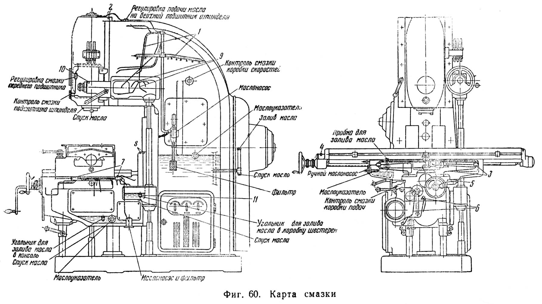 Работа масляной системы считается хорошей, если масло заполняет хотя бы частинично очко маслоуказателя; ето означает, что масло поступает обильно і не успевает вытекать. Работа масляной системы считается также удовлетворительной, если из подводящей трубки видна в очко струйка масла на стенке, хотя уровень масла в указателе отсутствует. Спереди станины, з левой стороны, помещается планка з кулачками, ограничивающими вертикальний ход консоли.