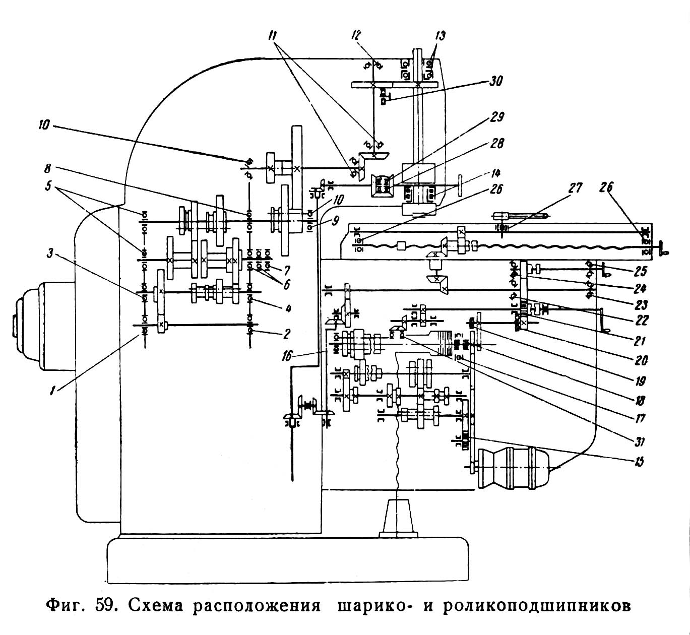 Схема розположення підшибників консольно-фрезерного верстата 6Н13. Дивитись у збільшеному масштабі