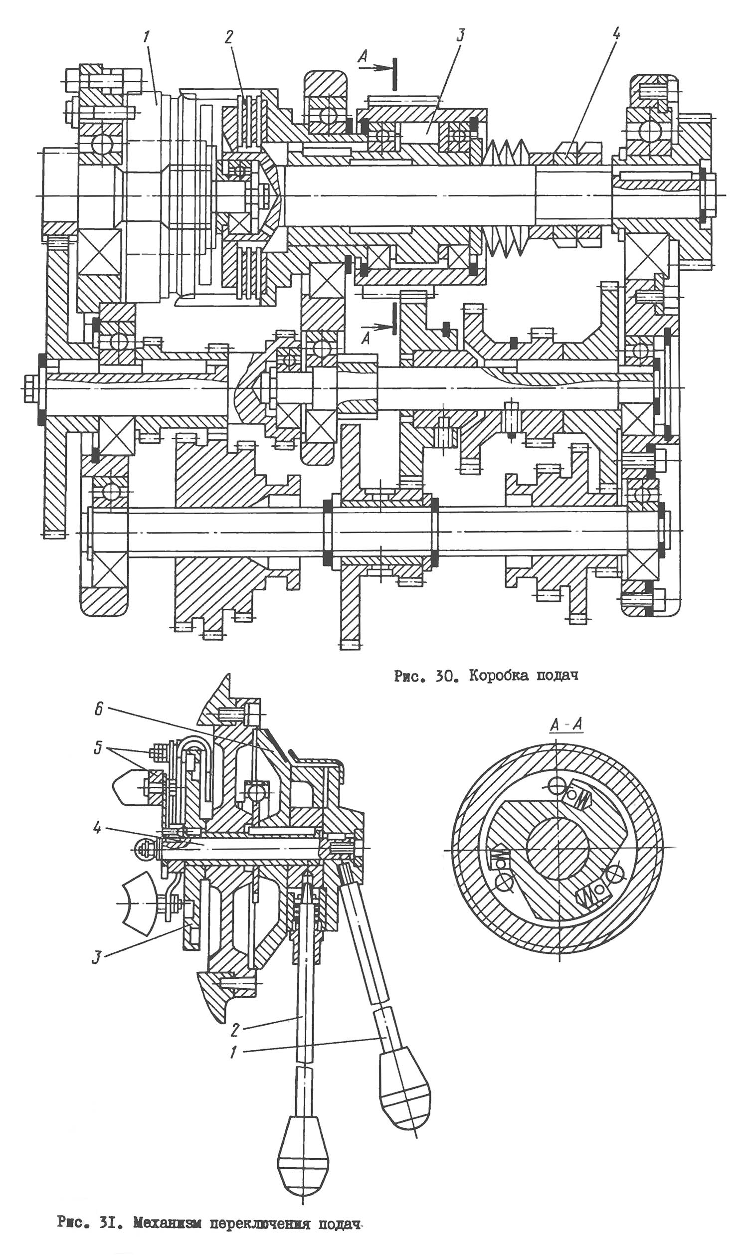 На одном валу з предохранительной муфтой смонтированы електромагнитная муфта I і обгонная муфта 3. Увімкнення быстрых перемещений стола осуществляется кнопкой II (см.рис. 12). Механізм переключения подач (ряс. 31) состоит из рукояток I і 2, кулачка з профильными пазами 3, лимба 6 ж рычагов 5 для переключения зубчатых колес