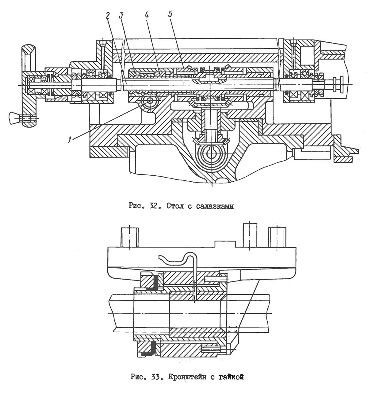 Салазки перемещаются на консоли в поперечном направлении і имеют направляющие для стола (рис. 32).