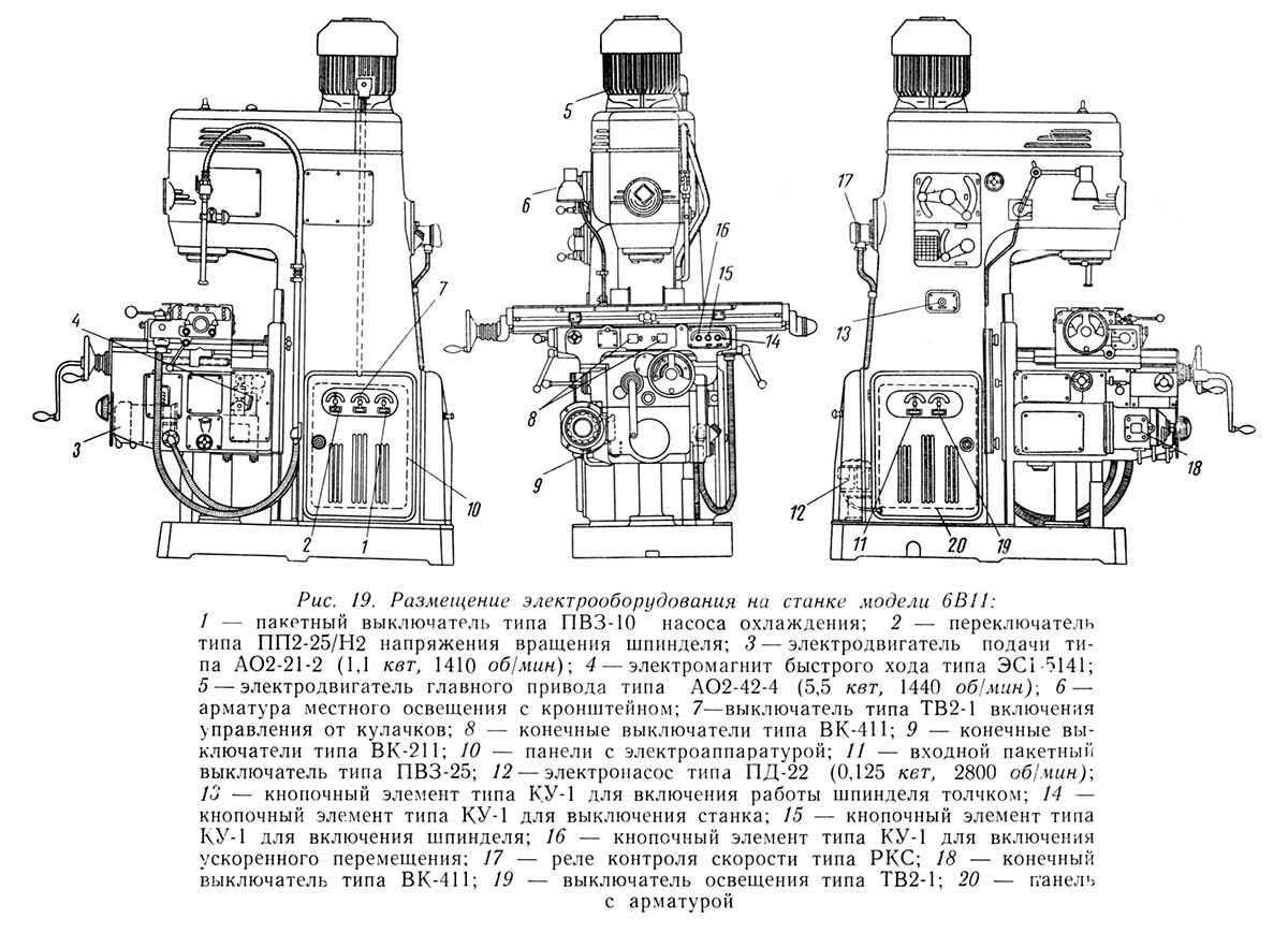 Напряжение на схему подается пакетным выключателем ВВ, расположенным на дверке левого шкафа керування. Пуск і зупинка шпинделя осуществляется нажатием кнопок 2КУ і 1КУ, расположенных на салазке верстата; одновременно включается електронасос охлаждения. Работа шпинделя толчком може производиться кнопкой 3КУ на левой стенке станины. Нужное направление обертання шпинделя устанавливается переключателем ПР, расположенным на дверке правого електрошафи. На станке моделі 6В11 подача стола може мати ручной напівавтоматический і автоматический цикл роботи.