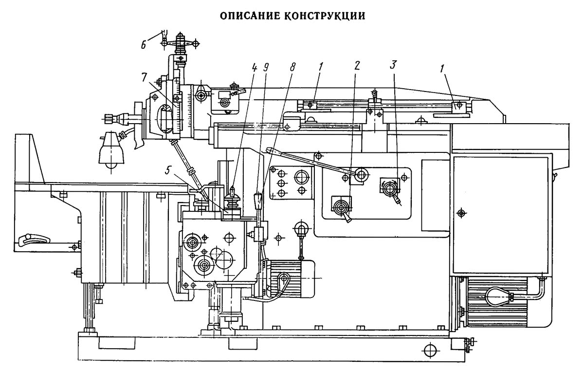Рукоятка 3 производит плавное регулювання скорости в пределах каждой ступени. Величина подачі стола регулируется маховичком 4. Отсчет величины подачі производится по лимбу 5.