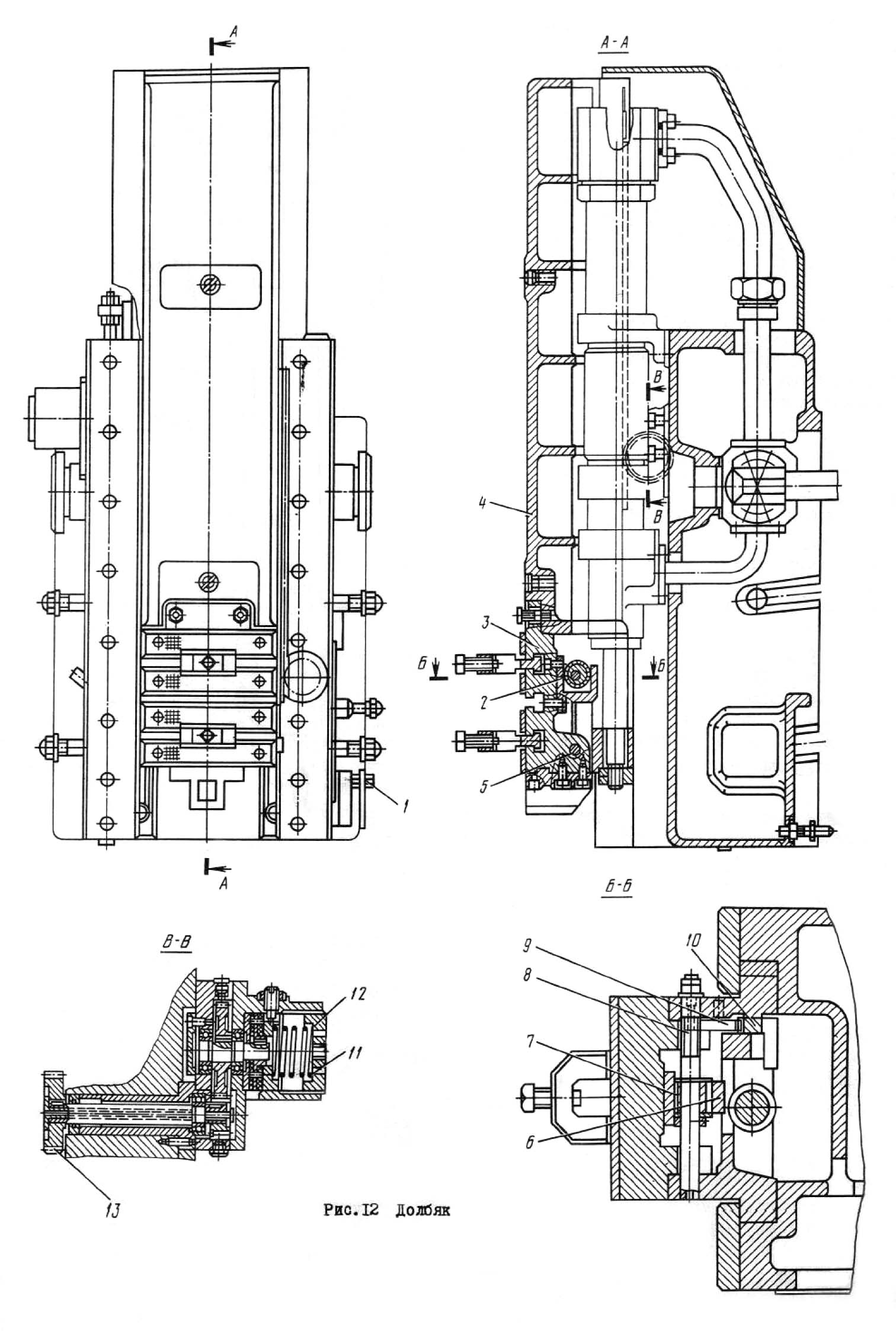 Долбяк 4 (рис. 12) представляет собой полую чугунную отливку, снабженную внутри ребрами жесткости. Долбяк имеет прямоугольные направляющие, которыми скользит по направляющим салазок долбяка. В нижней частини долбяка шарнирно закреплена откидная доска 3 з резцедержателями. Внутри долбяка смонтирован механізм автоматичною откидки резца при обратном ходе долбяка.