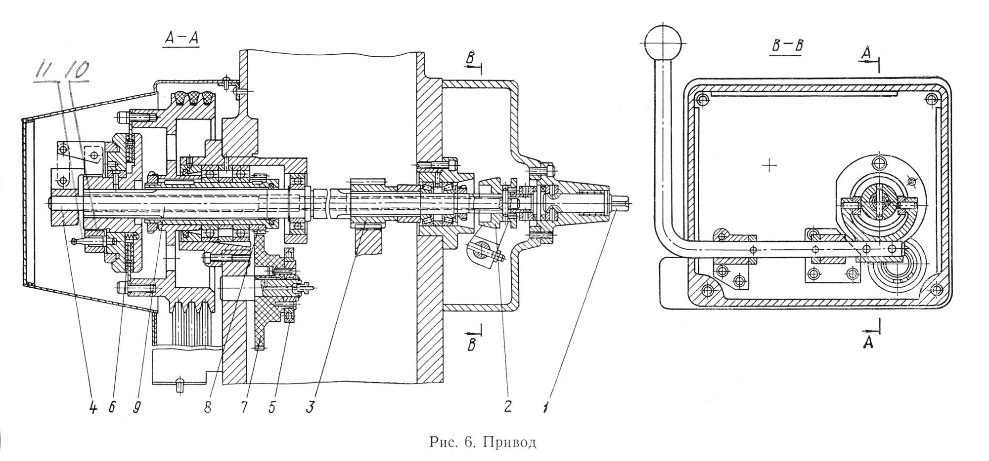 Выключение фрікциону происходит одновременно з торможением приводного вала і кулисного механізма. Для проворота приводу вручную служит валик 1 з квадратом. Блокируют тормозную колодку 2 і фрикционную муфту тягой 4. Шестерня 8 через шестерню 7 сообщает вращение ексцентрику 5 приводу масло-насоса.