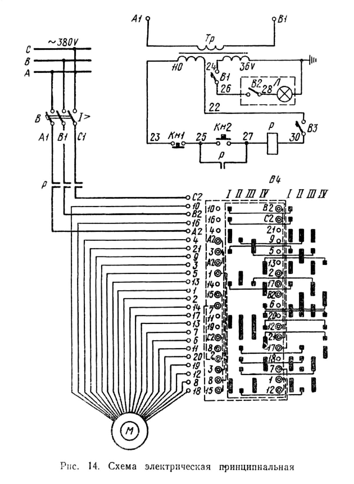 Увімкненням автоматичного выключателя В при включенном автоматическом выключателе ВЗ електросхема верстата подготовлена к работе. Нажатием на кнопку Кн2 по ланцюги 23-25-27-30 получает питание магнитный пускатель Р. который подключает електродвигатель М. После увімкнення магнитный пускатель ставится на самопитание. Изменение скорости обертання електродвигуна достигается изменением числа пар полюсов при помощи барабанного переключателя БП. Останов електродвигуна осуществляется нажатием на кнопку Кн1. Захист електроустаткування верстата от коротких замыканий осуществляется автоматическими выключателями В, В1 і В2. Минимальная защита електродвигуна обеспечивается магнитным пускателем Р.