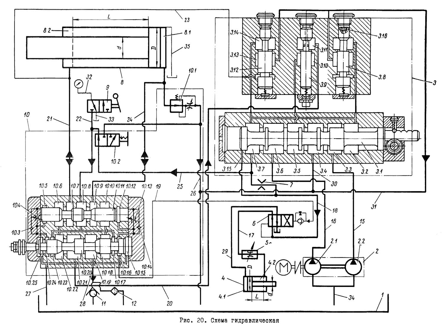 Схема гідравлічна строгального верстата 7Д37. Дивитись у збільшеному масштабі