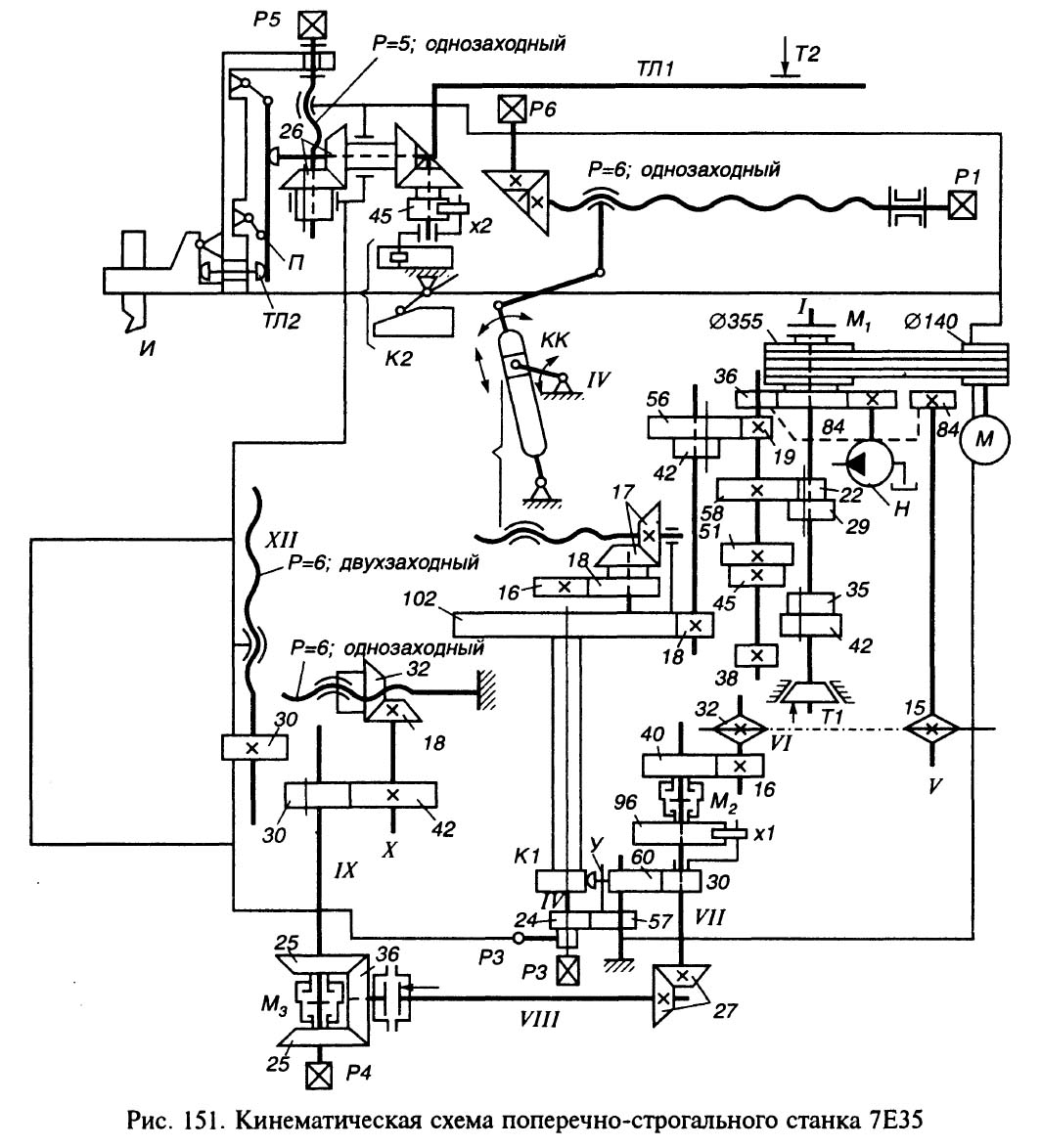 Кинематика верстата состоит из следующих ланцюгів. Асинхронный електродвигатель М (рис. 151) служит для всех механических перемещений вузлів верстата. Привід головного руху соединяет двигатель з ползуном і содержит коробку швидкостей (валы I, II і III) і кривошатунный механізм КК.
