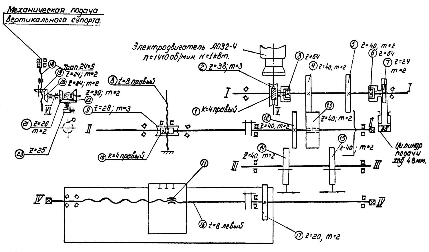 III положение рукоятки переключения швидкостей. Золотник 10 переключения находится на расстоянии 24 мм от крайнего правого положения, что соответствует третьей скорости (рабочая скорость 16—24 м/мин, скорость обратного ходу 48 м/мин).