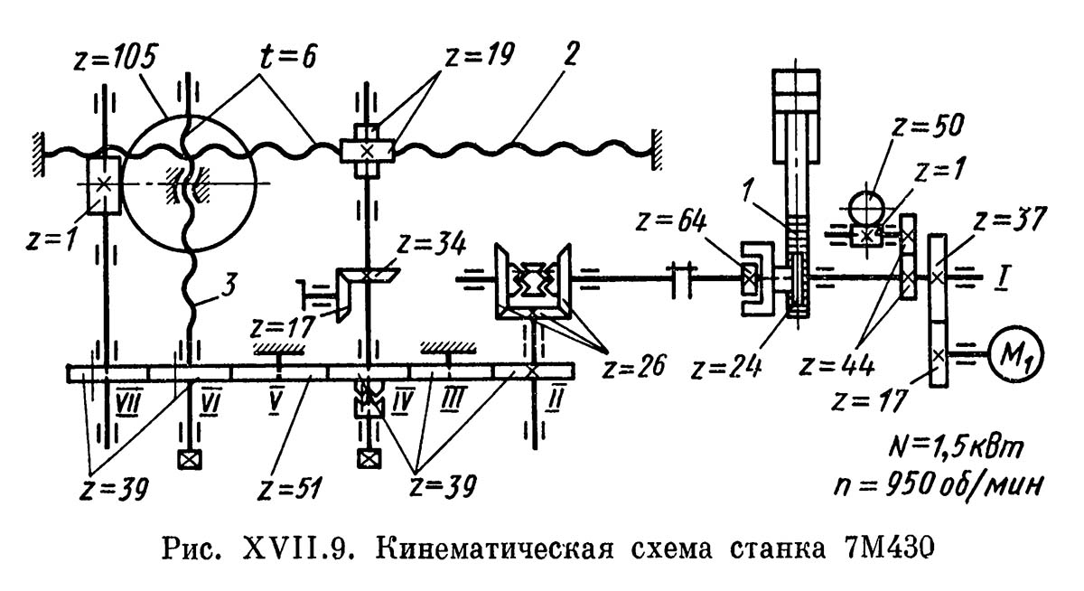 Таким образом, стол получает продольную, поперечную і круговую подачі за один двойной ход ползуна. Величина подач находится в следующих пределах: продольная і поперечная — 0,2—2,4 мм/дв. ход, круговая — 0,1—1,3°/дв. ход. Быстрые (установочные) переміщення в тех же направлениях столу сообщаются електродвигуном М1. Требуемая длина долбления обеспечивается специальным механізмом з кінематичної ланцюгю z = 44,44, z = 1, z = 50 (см. рис. XVII.9).