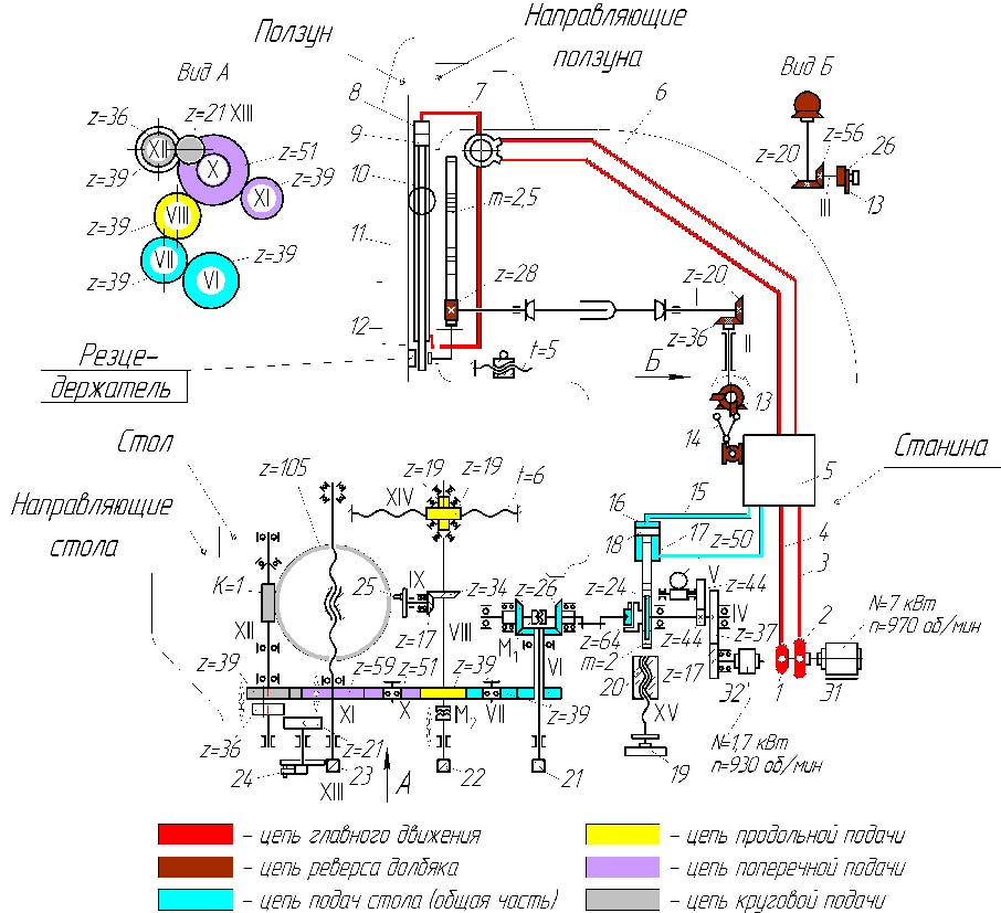 1. Схема кінематична долбежного верстата 7М430. Дивитись у збільшеному масштабі