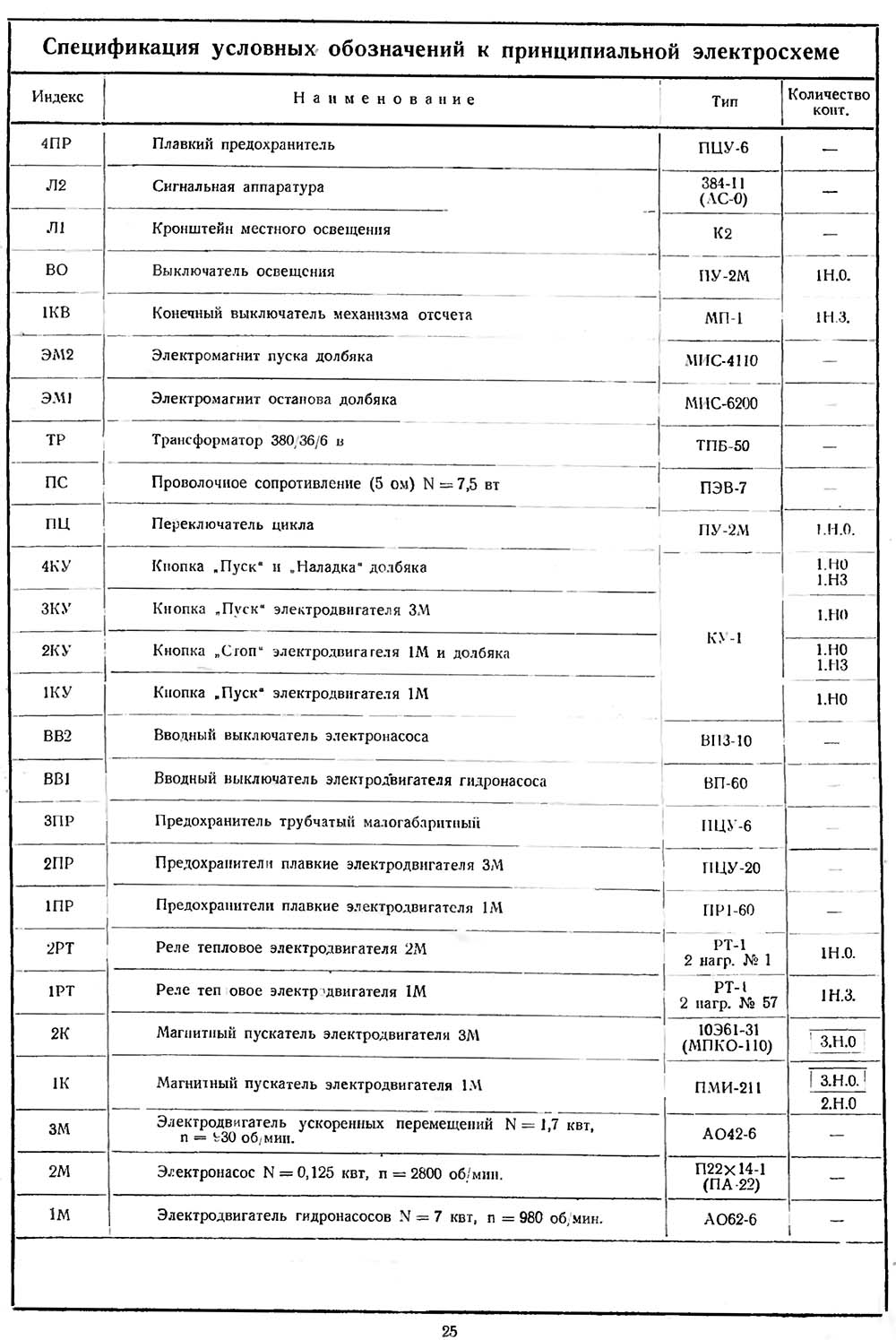 6. Ограничение холостого ходу головного електродвигуна осуществляется кнопкой «2КУ», которая имеет (Н. 3.) контакты в ланцюги керування головного двигуна в точках 2—3 і Н.О. контакты в ланцюги останова долбяка в точках Л16—10. Таким образом, при останове долбяка произойдет также останов головного двигуна.
