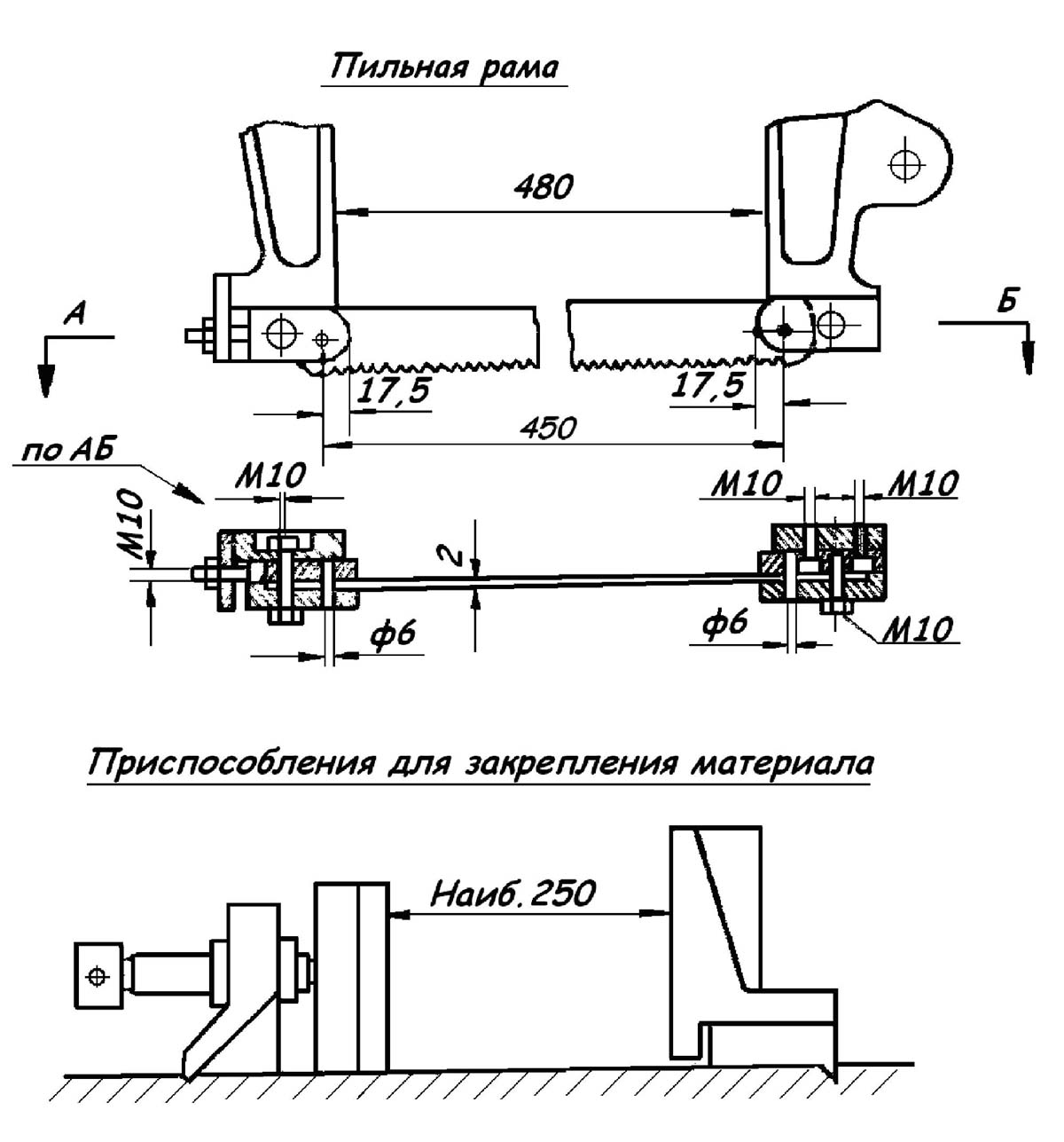 Для закрепления разрезаемого материала верстат снабжен специальными зажимами з плоскими рифлеными губками.