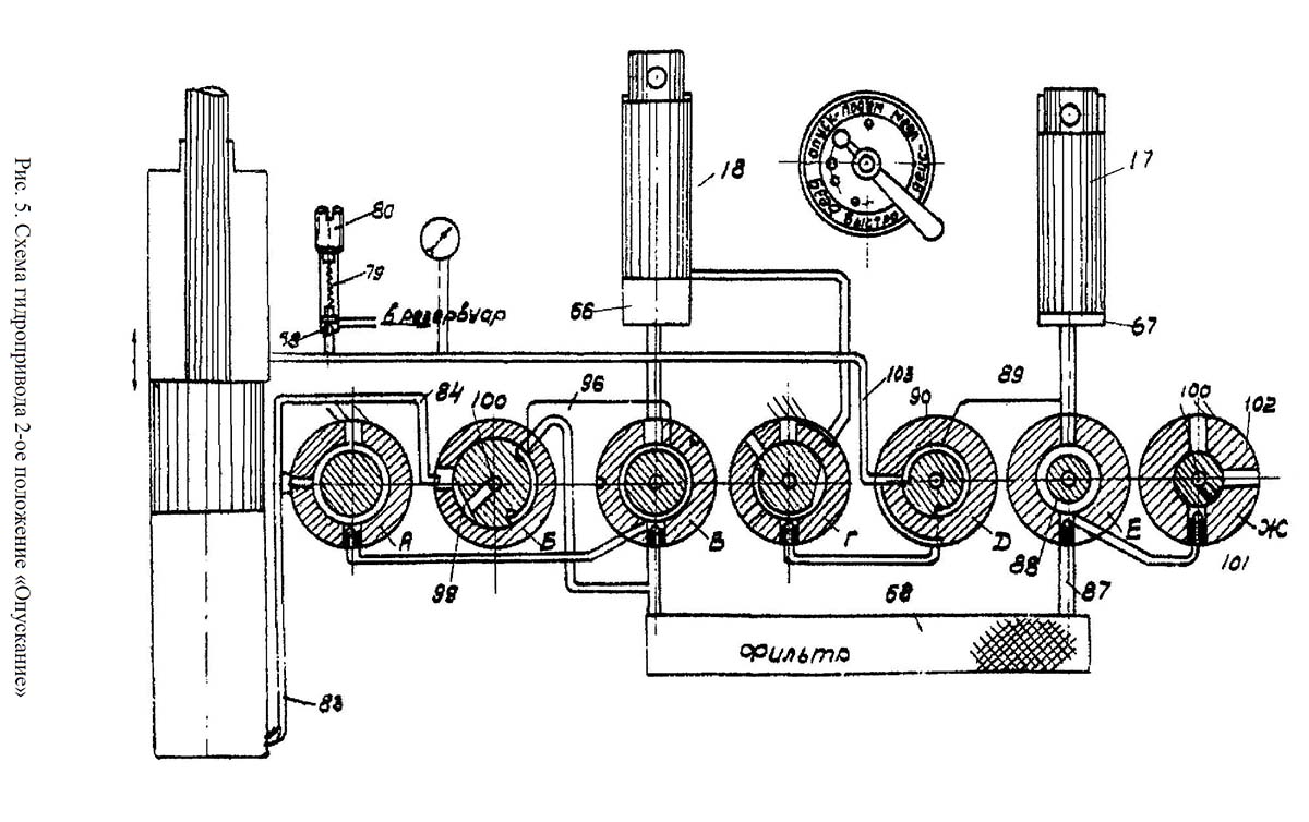 Давление сверху на поршень 78 в положении 4-ом незначительно, так как перепад давлений в дросселирующем канале 109 незначителен. При вращении рукоятки пробки крана из 4-го положения по часовий стрелке, сечение дросселирующего канала 109 постепенно суживается і давление сверху на поршень постепенно возрастает. В 5-м положении, получаемом поворотом рукоятки на 135° по часовий стрелке из 4-го положения, сечение дросселирующего канала сводится к нулю. Избыточный объем масла теперь поступает через предохранительный клапан 58 в резервуар. Предельное давление, на которое регулируется предохранительный клапан 58 не должно превышать 25 атм. і устанавливается по контрольному манометру 112.