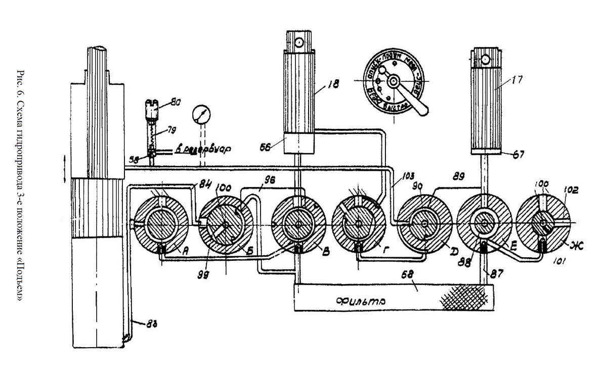 Масло из верхней полости цилиндра 20 имеет выход по каналам 103, 91, 92, 109, і 93 в резервуар і по каналам 103, 90, 89 і 88 і цилиндр 67, так как в етот момент поршень 17 движется вверх і засасывает масло.