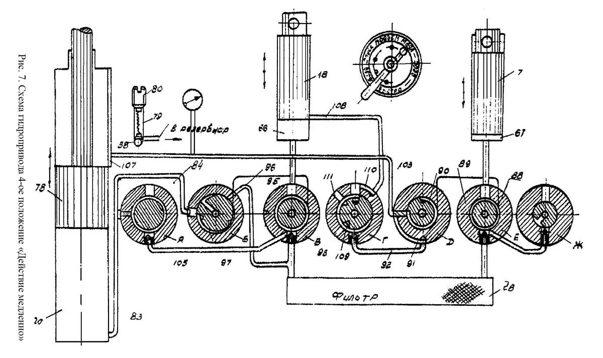 Схема гідроприводу ножовочного верстата 8725. 4-ое положение «Опускание медленно». Дивитись у збільшеному масштабі