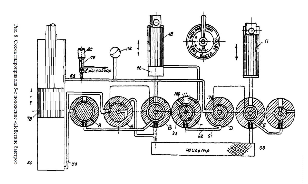 Схема гідроприводу ножовочного верстата 8725. 5-е положение «Действие быстро». Дивитись у збільшеному масштабі