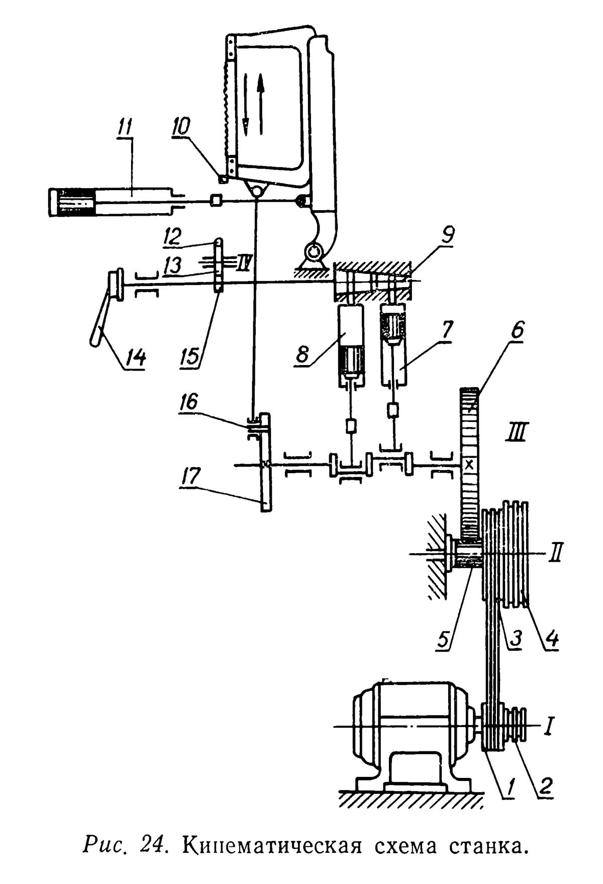 Рух от вала I (рис. 24) електродвигуна посредством клиноременной передачи і двух двухступенчатых шкивов 1, 2, 3, 4 передається на приводной вал II. Шкив, свободно вращающийся на валу II, сблокирован з шестерней 5. Через шестерню 5 і зубчатое колесо 6 рух передається валу III, на втором кінці которого закреплен кривошипный диск 17 з пальцем кривошипа 16.